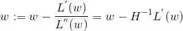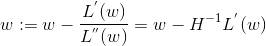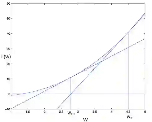牛顿法的基本思想是在极小点附近通过对目标函数做二阶Taylor展开,进而找到L(w)的极小点的估计值。形象地讲,在wk处做切线,该切线与L(w)=0的交点即为下一个迭代点wk+1(示意图如下)。w的更新公式如下,其中目标函数的二阶偏导数,即为大名鼎鼎的Hessian矩阵。