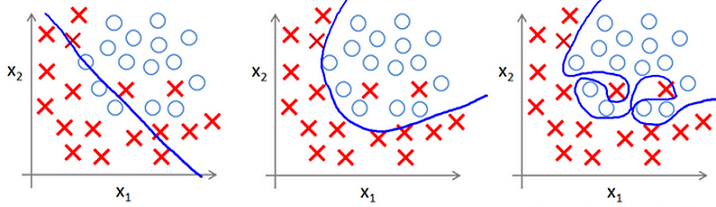 所谓Underfitting,即模型没有学到数据内在关系,如下图左一所示,产生分类面不能很好的区分X和O两类数据;产生的深层原因,就是模型假设空间太小或者模型假设空间偏离。