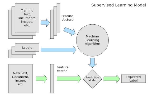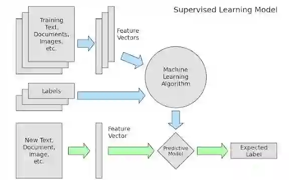 机器学习可以分为无监督学习(unsupervised learning)和有监督学习(supervised learning),在工业界中,有监督学习是更常见和更有价值的方式,下文中主要以这种方式展开介绍。如下图中所示,有监督的机器学习在解决实际问题时,有两个流程,一个是离线训练流程(蓝色箭头),包含数据筛选和清洗、特征抽取、模型训练和优化模型等环节;另一个流程则是应用流程(绿色箭头),对需要预估的数据,抽取特征,应用离线训练得到的模型进行预估,获得预估值作用在实际产品中。在这两个流程中,离线训练是最有技术挑战的工作(在线预估流程很多工作可以复用离线训练流程的工作),所以下文主要介绍离线训练流程。