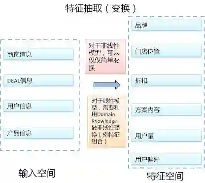 完成数据筛选和清洗后,就需要对数据抽取特征,就是完成输入空间到特征空间的转换(见下图)。针对线性模型或非线性模型需要进行不同特征抽取,线性模型需要更多特征抽取工作和技巧,而非线性模型对特征抽取要求相对较低。