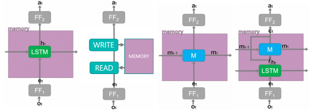 图2:模型架构。从左到右分别是 LSTM、DNC、SET 和 AMRL。AMRL 基于 SET 的汇总记忆,对 LSTM 加以扩展(例如,所观察到的平均值或最大值)。
