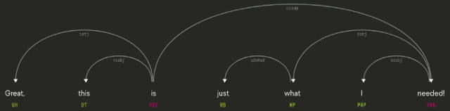 https://demos.explosion.ai/displacy/?text=Great%2C%20this%20is%20just%20what%20I%20needed!&model=en&cpu=1&cph=0