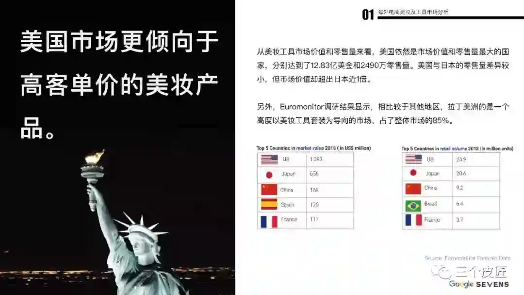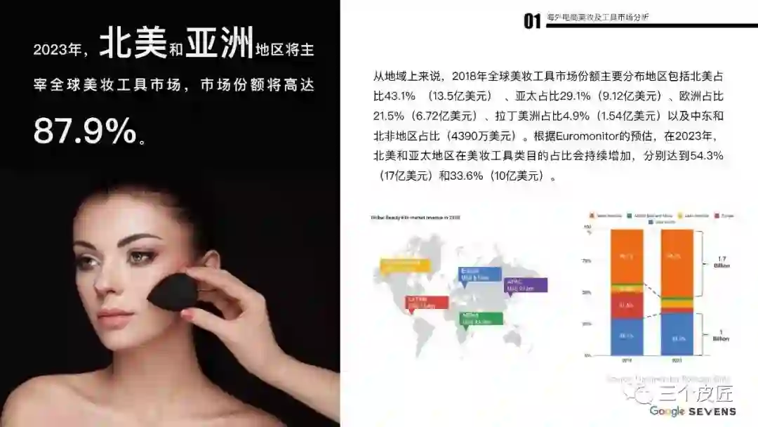 2018年,全球彩妆化妆品市场容量达到702亿美元,预计2025年将达到893亿美元,美妆工具销售额超过32亿美元,全球美妆工具搜索量超过8亿次。美国仍稳坐全球第一大化妆品市场。2018年北美地区美妆工具类市场规模为13.5亿美元,占全球市场的45%。
