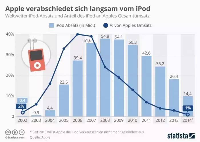 在 2008 财年,苹果售出了 1160 万台 iPhone 和 5480 万台 iPod,从当时的数据来看,iPod 无疑是苹果收入的重要组成。但到了 2014 年,iPod 的销量已经下跌到只有 1400 多万台,也正是在这个时候,苹果停产了 iPod classic,这也标志着苹果放弃iPod产品线的开始,苹果官网的 iPod 产品也开始被纳入到了“Music”一栏中,这也被认为是苹果开始弱化 iPod 影响的一个信号。