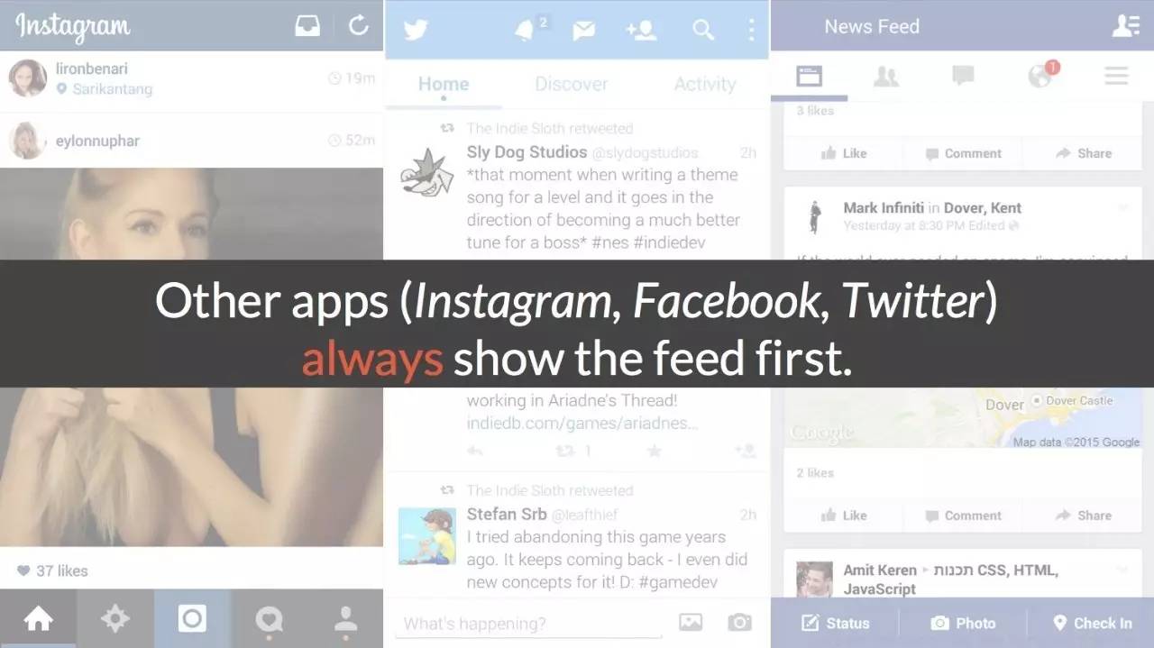 其他 app 们(Instagram、Facebook、Twitter)总是先展现信息源。