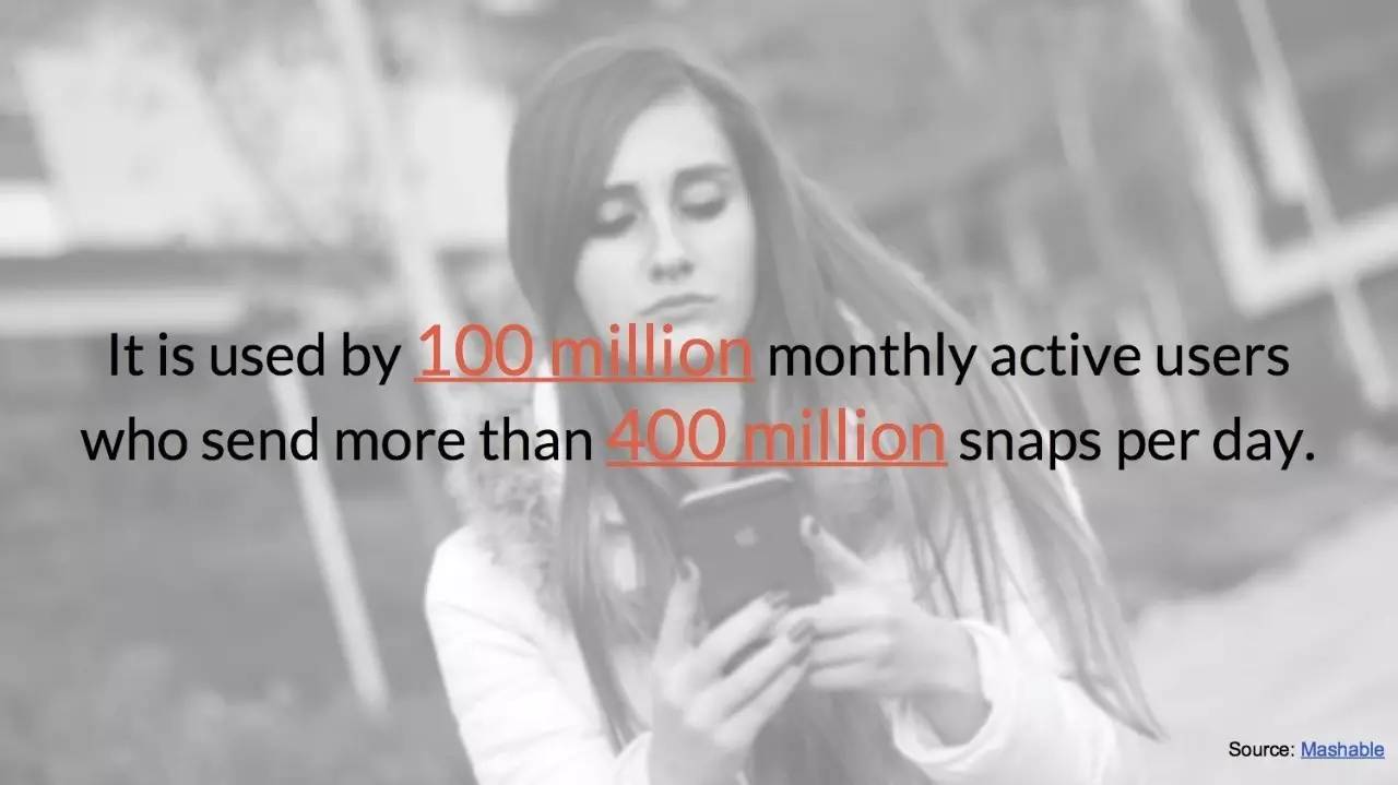月活跃用户量超过 1 亿,每天发送超过 4 亿的 snaps。这只是 2015 年的数据,最新的数据可以留意 Snap 财报。
