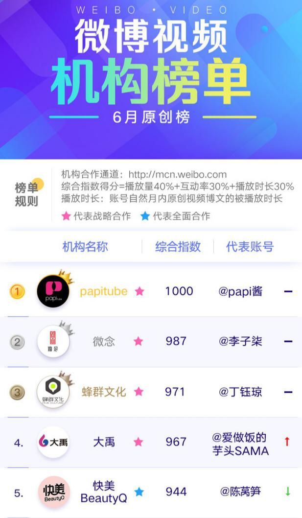 新浪微博今年公布的视频机构榜单中,papitube2月至5月份蝉联第一宝座,综合指数达到1000分,papi酱仍然作为代表账号(综合指数得分标准是以40%视频播放量、30%互动率、30%播放时长这三大因素综合所得)。