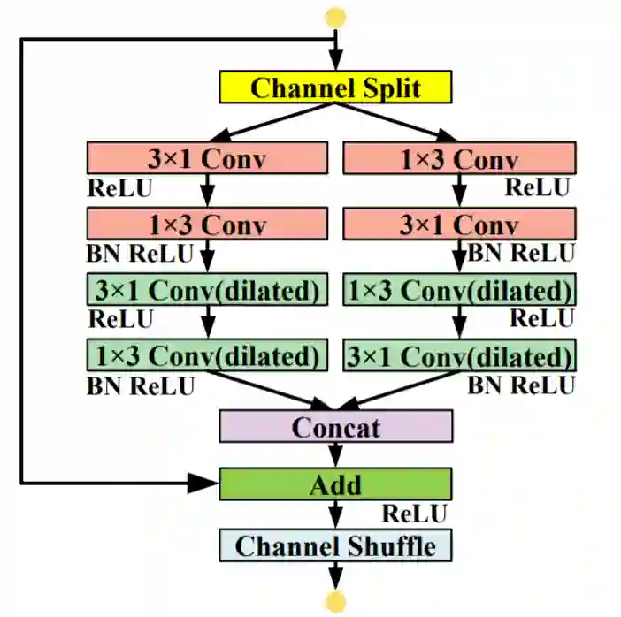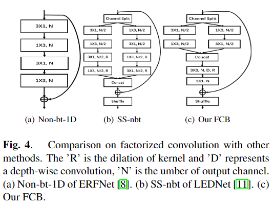 具有较大空洞率的空洞卷积核在空间中接收复杂的远程空间信息特征,并且在空间中需要更多参数。同时,具有较小空洞率的空洞卷积核在空间中接收简单的或较少信息的短距离特征,而只需要较少参数就足够了。因此FCB(上图(c))首先将通道拆分成两组,然后在两组通道中分别用两个一维卷积处理短距离和空间较少的信息特征,这样会大大降低参数和计算量。将两个通道合并后,FCB利用2维卷积来扩大感受野捕获远距离特征,并使用深度可分离卷积来减少参数和计算量。最后设置了通道混洗操作。
