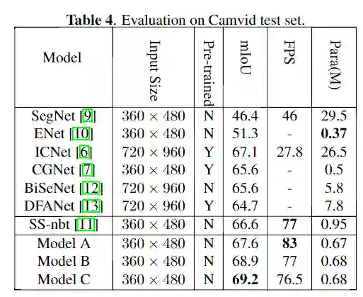 3、实验显示了LRNNet在Cityscapes数据集和Camvid数据集上兼顾了计算速度和分割精度,都具有不错的表现。