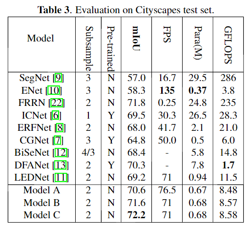 从表格可以看出,在Cityscapes测试集上,没有预训练步骤和额外的后处理过程,最终LRNNET模型在GTX 1080Ti显卡上的速度为71FPS,获得了72.2% mIoU,整体模型的参数量仅有0.68M。