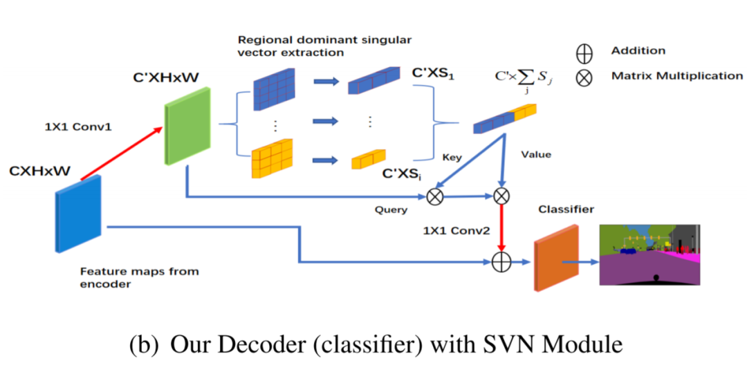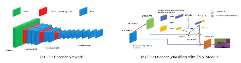 LRNNet整体结构:(a)LRNNet的编码器,由分解因子卷积块(FCB)和下采样模块组成 (b)LRNNet带SVN模块的解码器。上分支以不同比例的区域优势奇异向量来执行非局部运算。红色箭头表示1×1卷积,可调整通道大小以形成瓶颈结构。分类器(classifier)包括一个3×3卷积,然后是一个1×1卷积。