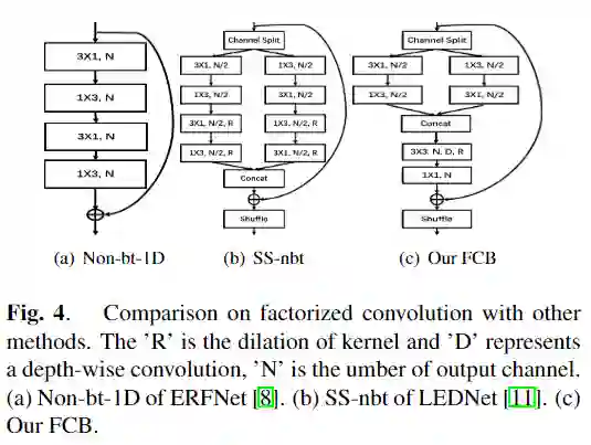 ERFNet 和LEDNet 仅使用一维因式分解内核来处理短距离和长距离特征。FCB能够利用一维分解因子小卷积核捕获短程特征的同时利用二维大卷积核捕获远程特征。