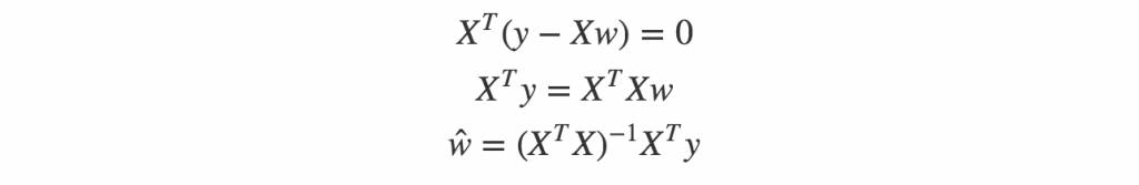 我们知道如果我们能够求得一个w使得Xw=y肯定是最好的,但是实际情况中y一般并不在矩阵X的列空间中,也就是此方程无解,于是我们希望通过将向量y投影到X的列空间中得到投影矩阵p, 然后求解Xw=p来获取一个最接近的一个解, 矩阵X的投影矩阵形式为