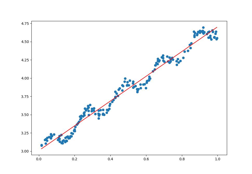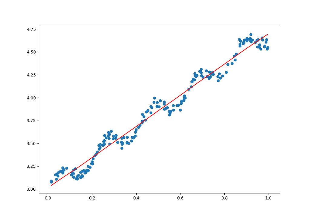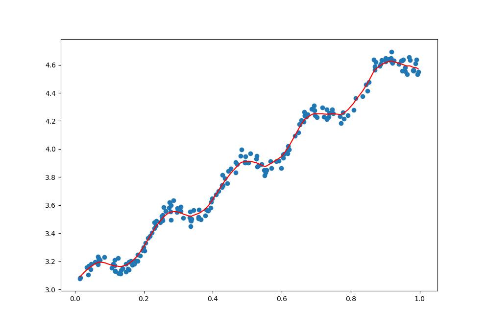 上面的数据点是通过公式y=3+1.7x+0.1sin(30x)添加噪声生成的数据,而标准的线性回归是一种无偏差估计,在计算所有点的时候都是无偏差的计算误差并通过优化方法优化误差,如果针对不同的点能够对误差进行调整便可以一定程度上避免标准线性回归带来的欠拟合现象。
