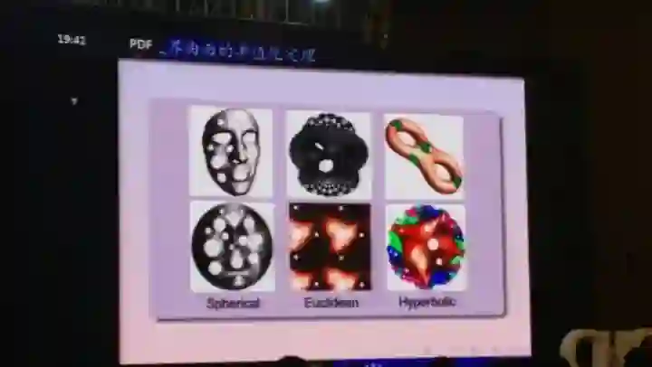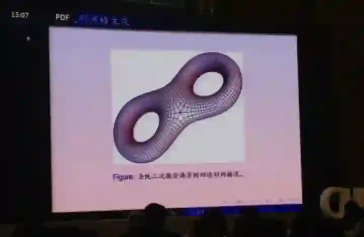 前面这些应用到一个数学上很重的定理,叫做庞加莱单值化定理,这是一个从黎曼时候开始的定理。就是讲映射的图形只跟它的拓扑性有关,这上面有三种几何,分别为:球面几何、欧氏几何、双曲几何。所有二维的几何,不管是什么样子的,我们都可以用这三种几何来分类。因此我们就可以将很复杂的事情很简单地描述出来。