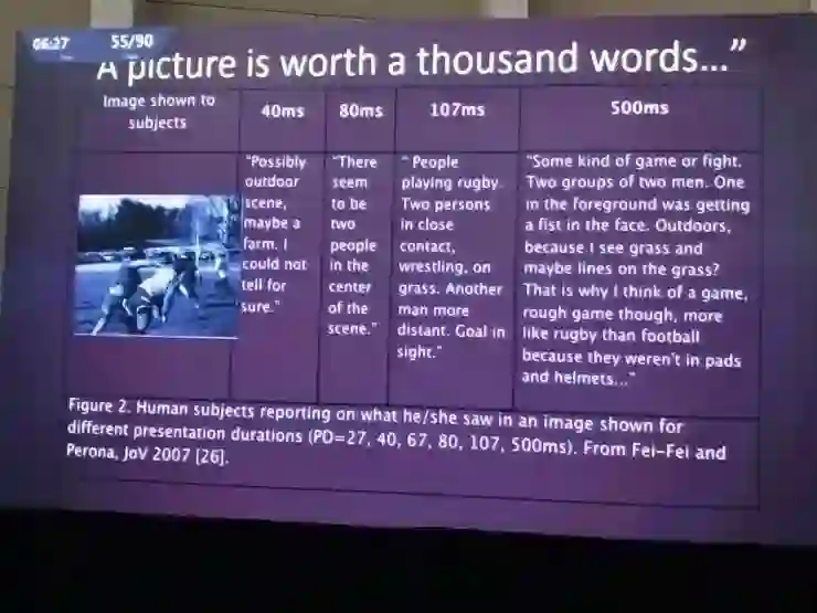 接下来就让他们尽可能多地写下自己看到的东西。从结果上看,有的照片好像比较容易,但是其实只是因为我们选择了不同长短的展示时间,最短的照片只显示了27毫秒,这已经达到了当时显示器的显示速度上限;有些照片显示了0.5秒的时间,对人类视觉理解来说可算是绰绰有余了。