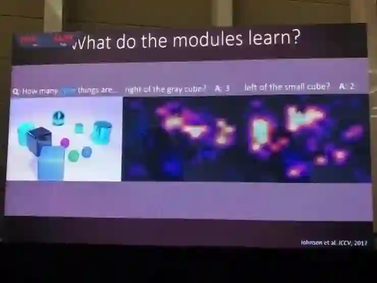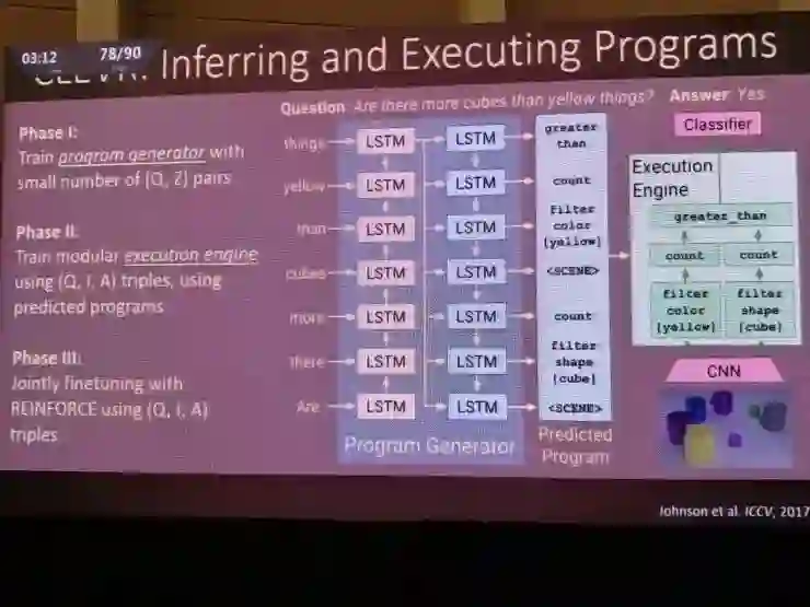 而在ICCV上,他们介绍了新一篇论文中的成果。借助新的CLEVR数据集,把一个问题分解成带有功能的程序段,然后在程序段基础上训练一个能回答问题的执行引擎。这个方案在尝试推理真实世界问题的时候就具有高得多的组合能力。