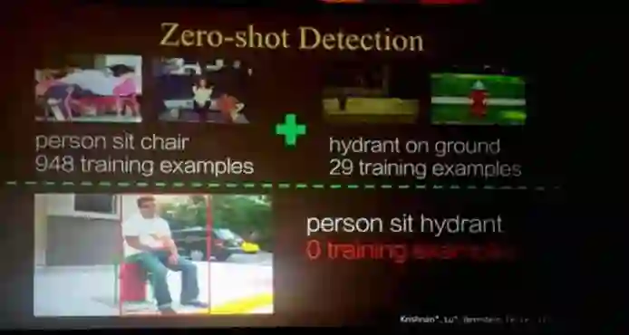 除了关系预测之外,还可以做无样本学习。举个例子,用人坐在椅子上的照片训练模型,加上用消防栓在地上的图片训练模型。然后再拿出另一张图片,一个人坐在消防栓上。虽然算法没见过这张图片,但能够表达出这是“一个人坐在消防栓上”。