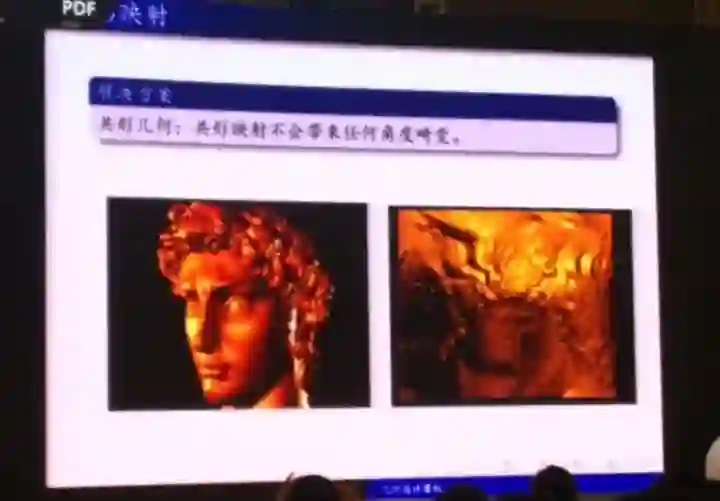 当我们将图形整体光滑映射到参数区域,使几何变得很小,会破坏掉整个图形;一般来讲这个要用手工来做,否则的话它变化非常大。针对这个问题,我们使用了纹理贴图、法向量贴图等等的方法。共性几何是一个很重要的从很古典的黎曼几何中产生的几何。