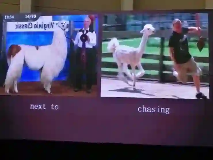 两张照片都是人和羊驼,但是发生的事情完全不同。这就是单纯的物体识别所无法描述的了。