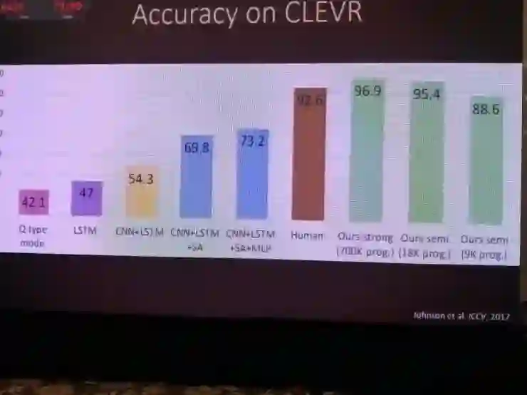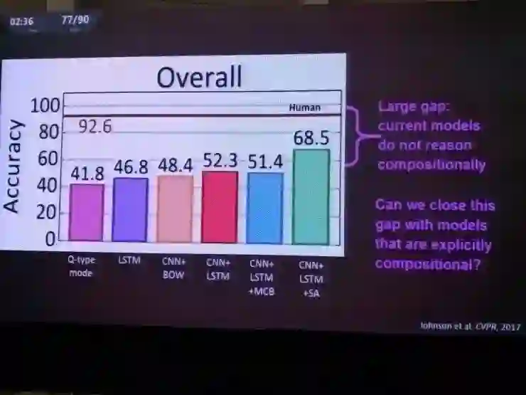 在这方面的第一篇论文用了CNN+LSTM+注意力模型,结果算不上差,人类能达到超过90%的正确率,机器虽然能做到接近70%了,但是仍然有巨大的差距。有这个差距就是因为人类能够组合推理,机器则做不到。