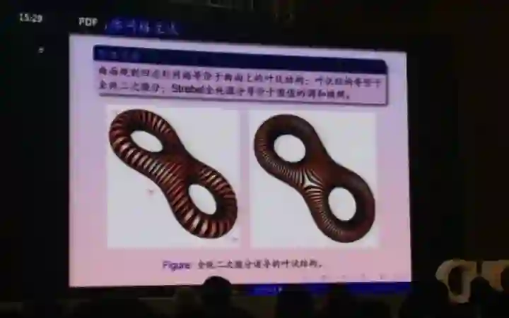 再比如,我们看这个曲面,在这个曲面上我们画出一些叶状的结构,可是它也有一定的奇异点。我们将这些奇异点分类,得出了一些在计算机科学上有意义的结论。