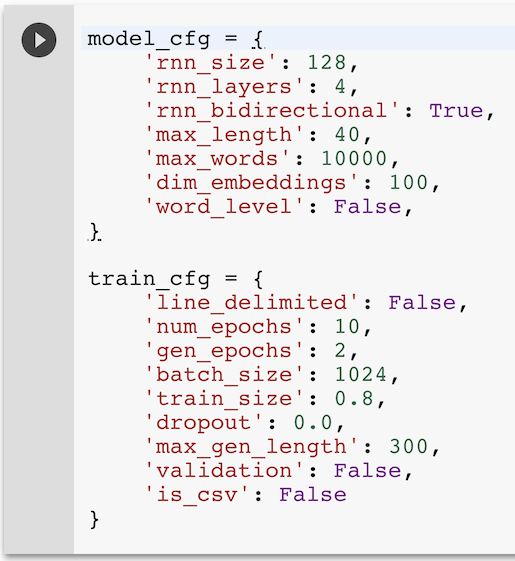 Colaboratory notebook 的另一个优点是,你可以快速地调整模型参数、上传新文件,并且立刻开始训练它。由于没有特殊的规则,我们将 line_delimited 设定为 True,将 rnn_bidirectional 设定为 False。对于单词级别的训练,我们将 word_level 设定为 True,将 max_length 设定为 8 来反映新的训练架构。由于训练长度被减少到了五分之一,我们可以将 num_epochs 设定为 50,将 gen_epoch 设定为 10 来平衡它。接下来,我们重新运行配置单元以更新参数,上传 Reddit 数据文件,并且重新训练模型。