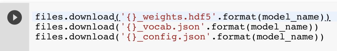 训练完成后,运行下一个单元将下载以下 3 个文件:一个权重文件(weights)、一个词汇表文件(vocabulary),以及一个配置文件(config),如果你想在其他地方重新生成该模型,这些文件都是必要的。