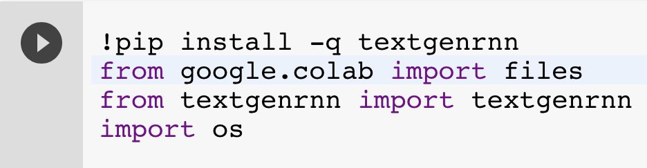 首先,我建议将该 notebook 复制到硬盘上(如果你没有这么做,那么请使用 Google Chrome 浏览器访问它)。Colaboratory 虚拟机包含了 Python 3 和像「Tensorflow」这样用于机器学习的通用 Python 程序包。但是你可以直接在 notebook 中安装更多的程序包。比如 textgenrnn!只需要点击进入这个单元并且点击「play」按钮(或者使用 Shift + Enter)即可运行这个单元格,其它的部分都将由它控制: