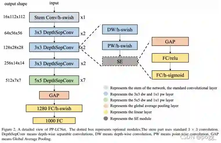 最主要的组成部分时深度可分离卷积,从第一层的CBH开始(conv+bn+hardswish),中间包含了13层dw,而后面的GAP是指7*7的Global Average Pooling,GAP后面再加point conv+FC+hardswish组件,最后是输出为1000的FC层,想要了解更详细的可以查看论文: