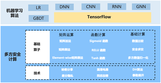 基础算子层:在安全技术层基础上,我们会做一些基础算子的封装,包括多方数据安全求交、矩阵加法、矩阵乘法,以及在多方场景下,计算 sigmoid 函数、ReLU 函数等等;同一个算子可能会有多种实现方案,用以适应不同的场景需求,同时保持接口一致;