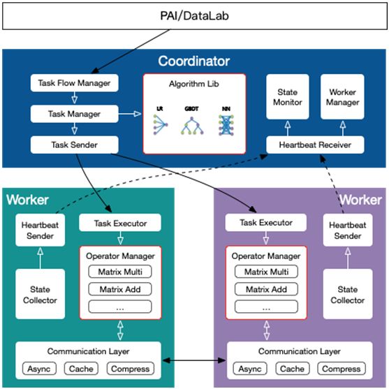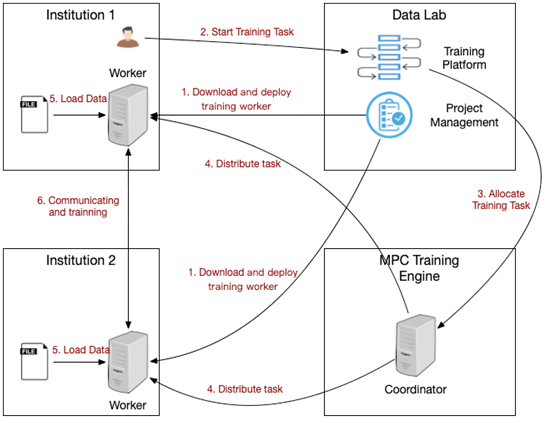 Worker 之间根据下发的训练任务,通过多方安全协议交互完成训练任务