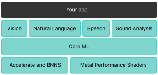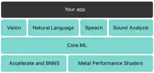 Core ML 还是一些其他苹果框架和功能的基础。CoreML是视觉处理,自然语言,speech转换音频文本,以及音频识别的核心模型,Core ML 本身构建于低层面的原语之上,比如 Accelerate and BNNS 和 Metal Performance Shaders。