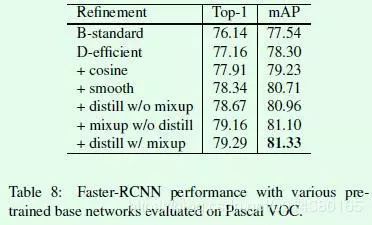 最后作者也证明了在分类算法中的这些优化点在其他图像任务中同样有效,比如目标检测任务,如Table8所示,可以看出在ImageNet数据集上表现最好的图像分类算法同样在VOC数据集上有最后的表现。