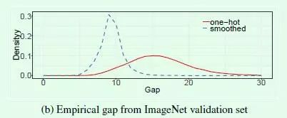 2、采用label smoothing,这部分是将原来常用的one-hot类型标签做软化,这样在计算损失值时能够在一定程度上减少过拟合。从交叉熵损失函数可以看出,只有真实标签对应的类别概率才会对损失值计算有所帮助,因此label smoothing相当于减少真实标签的类别概率在计算损失值时的权重,同时增加其他类别的预测概率在最终损失函数中的权重。这样真实类别概率和其他类别的概率均值之间的gap(倍数)就会下降一些,如下图所示。