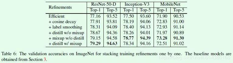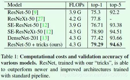首先可以先来看看作者训练的ResNet50网络的效果。在Table1中对比了目前几个常用分类网络的效果,最后一行是作者通过添加各种训练技巧后复现的ResNet-50效果,和原论文的结果对比提升非常明显(top-1准确率从75.3提升到79.29)。
