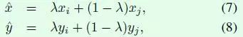 4、引入mixup,mixup其实也是一种数据增强方式,假如采用mixup训练方式,那么每次读取2张输入图像,假设用(xi,yi)和(xj,yj)表示,那么通过下面这两个式子就可以合成得到一张新的图像(x,y),然后用这张新图像进行训练,需要注意的是采用这种方式训练模型时要训更多epoch。式子中的λ是一个超参数,用来调节合成的比重,取值范围是[0,1]。