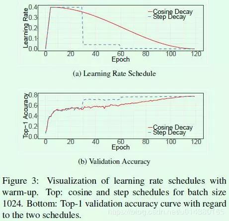 1、学习率衰减策略采用cosine函数,这部分的实验结果对比可以参考Figure3,其中(a)是cosine decay和step decay的示意图,step decay是目前比较常用的学习率衰减方式,表示训练到指定epoch时才衰减学习率。(b)是2种学习率衰减策略在效果上的对比。