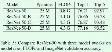 2、ResNet-C,改进部分就是将Figure1中input stem部分的77卷积层用3个33卷积层替换。这部分借鉴了Inception v2的思想,主要的考虑是计算量,毕竟大尺寸卷积核带来的计算量要比小尺寸卷积核多不少,不过读者如果仔细计算下会发现ResNet-C中3个33卷积层的计算量并不比原来的少,这也是Table5中ResNet-C的FLOPs反而增加的原因。