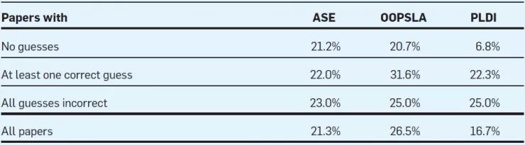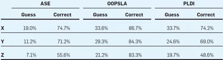其中 X 代表专家,Y 代表研究学者,Z 代表普通学者(均为自评)。如上图所示,「专家们」显然更喜欢预测,然而预测准确性却没有比另两类人高多少(PLDI 的 Z 类评审除外)。所以结论是那些自认专家的更加喜欢猜测论文作者,正确性却不值一提。