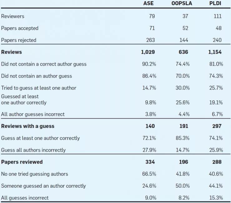 假如评审者在评论中猜测论文作者,他们大概率会猜对(ASE 72% 的猜测能够猜对,OOPSLA是 85%,PLDI 是74%)。不过实际情况中,绝大多数的评审意见中并没有真的包含正确的猜测结果(ASE 90%,OOPSLA 74%,PLDI 81%)。
