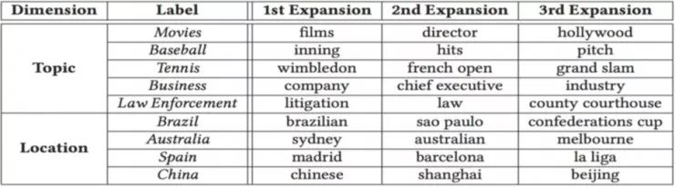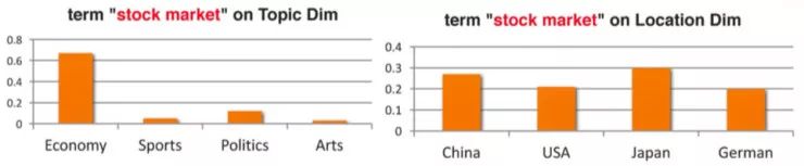 例如「stock market」,它在每个 Location 维度中分布的概率基本一致,这说明「stock market」这个 term 不属于 Location 这个维度;而另一方面,它在 Topic 维度的分布则有很强的差别性。根据一个称为 Dimension-Focal Score 的标准可以判别出它是属于 economy 标签下的。