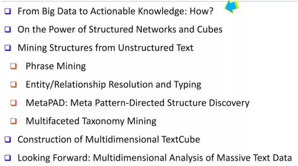 韩家炜认为要想将现有的无结构的 Big Data 变成有用的 Knowledge,首先要做的就是将数据结构化。他提出两种结构化数据的形式,一种是异质网络(Heterogeneous Network),另一种是多维文本立方体(Multi-dimensional Text Cube)。由这种结构化数据生成 Knowledge 已经证明是很强大的,但是如何将原始无结构的数据变成有结构的数据(Network 或 Text Cube)则是非常困难的。