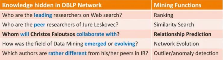 如果将 DBLP 的文献信息(例如论文、作者、出版地等)整合到 Network 中,那么显然这个网络中蕴涵着丰富的信息,例如我们可以通过排名函数从网络中挖掘出谁是 Web 研究的领军人物,或者通过相似性搜索函数从网络中挖掘出一个学者的同行;通过关系预测来挖掘一个学者未来的合作者将是谁;通过网络演化来发掘 Data Mining 学科是如何出现和发展的等等。
