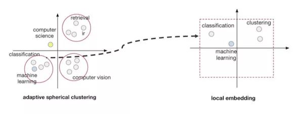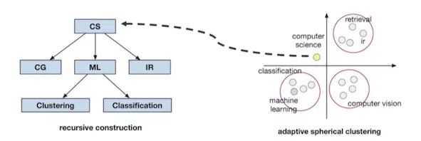 韩家炜说,自动建立层级分类其实「挺难的」。他们经过多种尝试后,提出了两种有效的方法:Adaptive Spherical Clustering 和 Local Embedding。