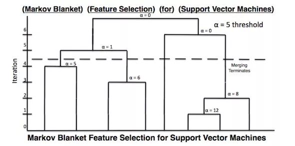 举个例子,对于一个论文标题「Markov Blanket Feature Selection for Support Vector Machines」,不同的分割方法可能会将它划分到不同的 Topic 里面,例如仅仅根据「Vector」,可能会把这篇文章划分到数学、物理的 Topic 中。但是显然「Support Vector Machines」是一个整体,它是属于计算机的 Topic。根据上述公式的迭代,则可以将这个标题进行如下的 Phrase 分割。