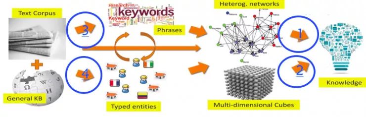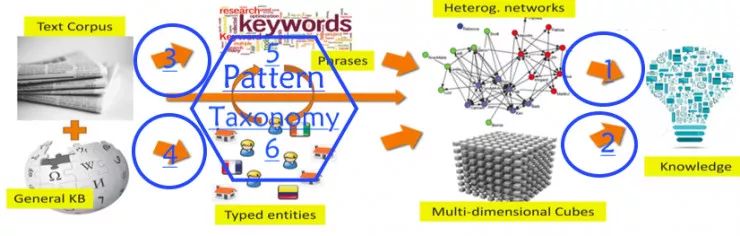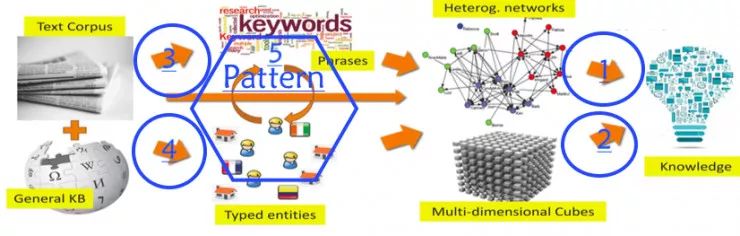(2)将文本数据转化为有类型的 Network/Text Cube。将文本数据变成有结构、有类型的数据(Network/Text Cube)