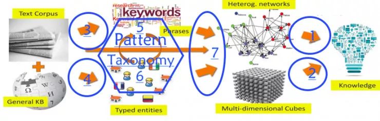 韩家炜团队的人员近几年主要的研究工作正是围绕着这个问题进行的,即怎样从 Text 中挖掘 Phrases、怎样从 Text 中挖掘 Typed Entities、以及怎样把这些 Phrases/Typed Entities 变成 Network/Text-cube(第四节内容)。