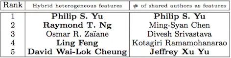 这个课题导致孙怡舟随后提出了我们现在广泛使用的 Meta path 的概念,并于 2011 年在 ASONAM 上发表了一篇影响力巨大的文章。在文章中,孙怡舟预测了裴建的合作者。根据裴建在 [1996-2002] 年间的文章(作为特征集)准确地预测了他在 [2003-2009] 年间会有哪些合作者(测试集),排名前五的预测中只有一个没有出现在测试集中。