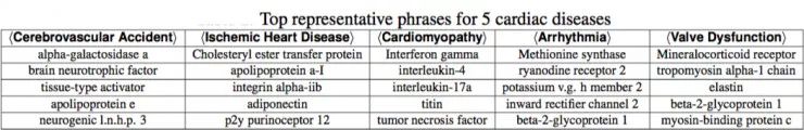 讨论过后,韩家炜等人从 PubMed(一个医学文献库)中抓取了「心血管疾病」相关的十年的数据,大约有 50 万篇 paper。他们使用这 50 万篇 paper、6 类心脏病以及医学教授们列出的 250 种蛋白质,根据和挖掘 NY Times 一样的算法,很快就得到了针对每一类心脏病的相关蛋白质排序,如下表(仅列出 Top 5)。